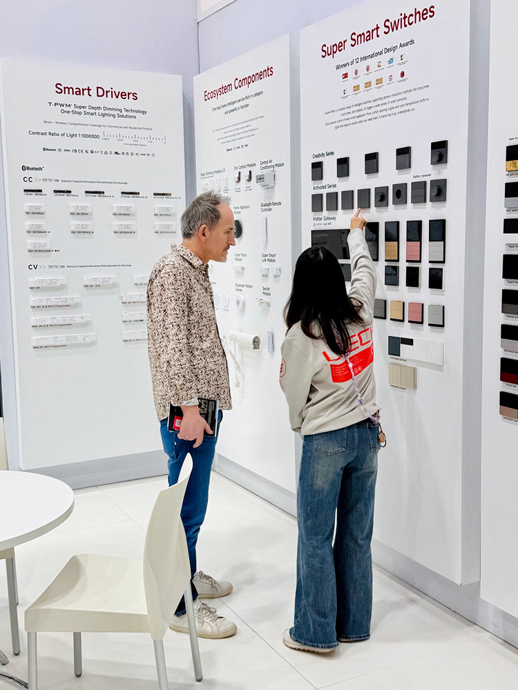 带来摩德纳系列智能面板、迪拜系列智能旋钮、超级智能面板系列等明星产品,兼具前沿工业设计美学与极致操作体验,斩获13项国际设计大奖,成为现场视觉与功能的双重亮点。
