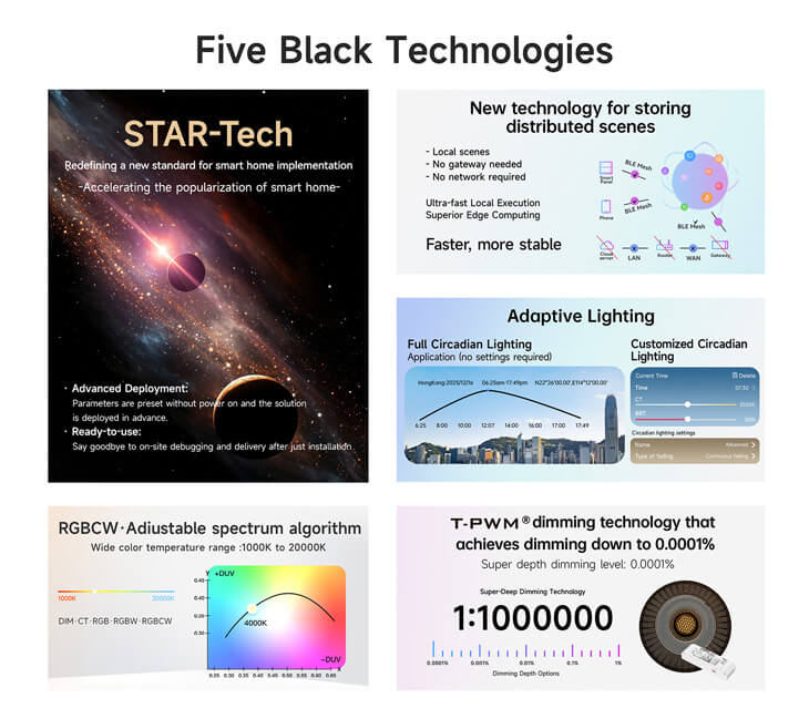 LTECH's core competitiveness stems from its relentless pursuit of innovative technologies,Empowered by five major black technologie:Distributed Scene Storage Super Human-Centric Adaptive Intelligent Lighting、T-PWM® Million-Level Super-Deep Dimming、RGBCW Wide Color Gamut and Wide Color Temperature Adjustable Spectrum Algorithm and STAR-Tech Interstellar Technology,it demonstrates strong technical strength.