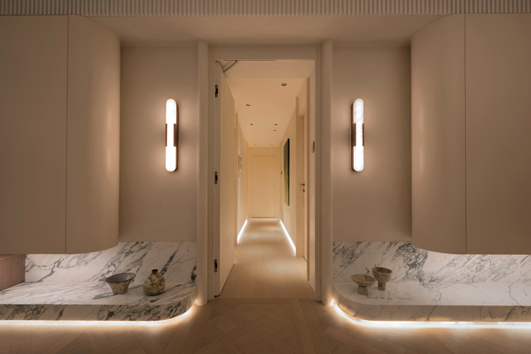 Moving beyond clichéd trends, the designer masterfully integrated the lighting with materials like natural stone, artisanal paint, and parquet flooring. From the living room's skyline-view accent lighting, to the study's soft daylight ambiance, and the dining area's warm atmospheric glow – each play of light and shadow meticulously complements the character of its space.