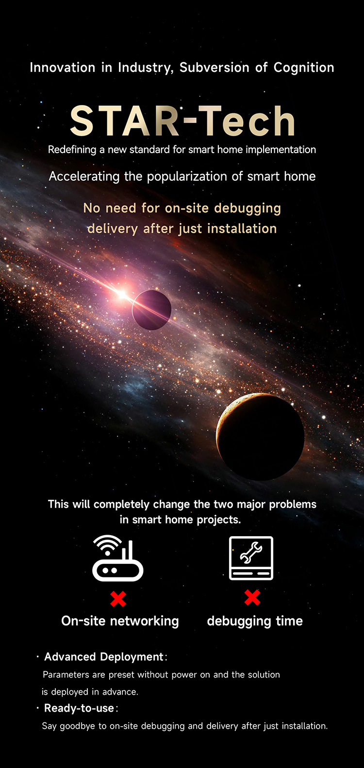 The application of STAR-Tech interstellar technology enables hotel intelligent solutions to achieve "pre-deployment without power supply". Parameters and scenario settings can be input during the construction phase, and delivery is completed upon implementation. The distributed scenario storage technology even breaks the dependence on gateways, ensuring that local scenarios can run at high speed even when the network is disconnected.