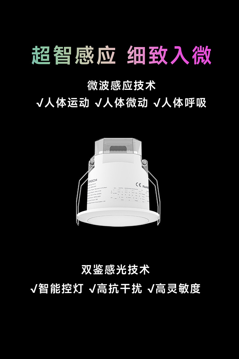 雷特微波人体存在感应器,具备微波感应技术、双鉴感光技术、滤除红外干扰技术等前沿科技,实现对人体感应器的人性化控制。一方面,搭配雷特智能网关,可实现更丰富的灯光场景联动控制;另一方面,产品具有蓝牙5.0 SIG Mesh系统,可实现本地场景使用,断网、去网关亦可控。真正做到“你之所在,光之所及”,随时随地守护用户。