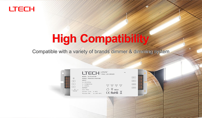 Ltech adopts international leading technologies on this Triac dimmable driver.Making efforts and working so hardly for developing excellent dimming products, to go through difficulties on actual application environment at home and abroad. Ltech realizes Triac dimming as accurate as digital signals, excellent in dimming and compatibility.