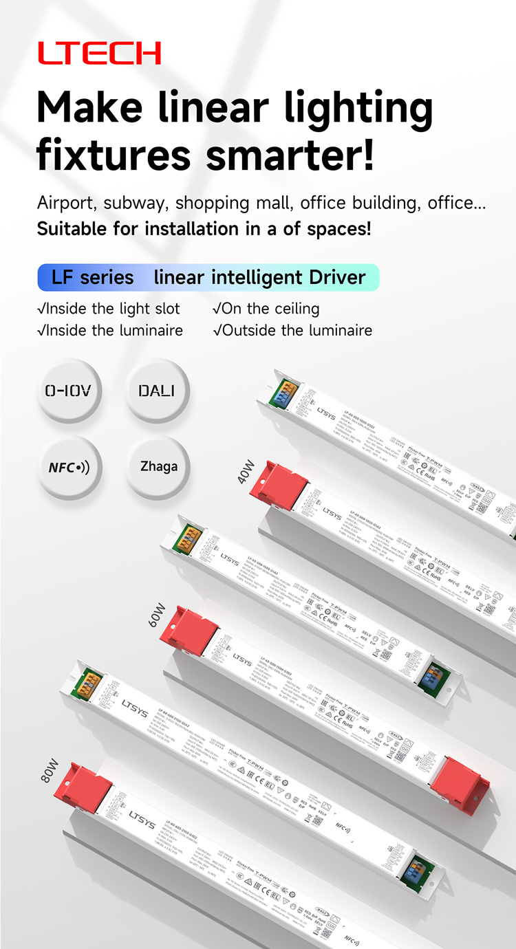 Specifically designed for linear lamps, the LF series linear intelligent power supplies offer two product lines: built-in and external. They strictly adhere to installation standards and perfectly meet the application needs of scenarios such as office buildings and shopping malls. All built-in products in the series comply with Zhaga standards. This series of products has passed TÜV certification and also obtained international certifications such as ENEC and CE issued by TÜV Germany, making it the preferred solution for global high-end office lighting projects.