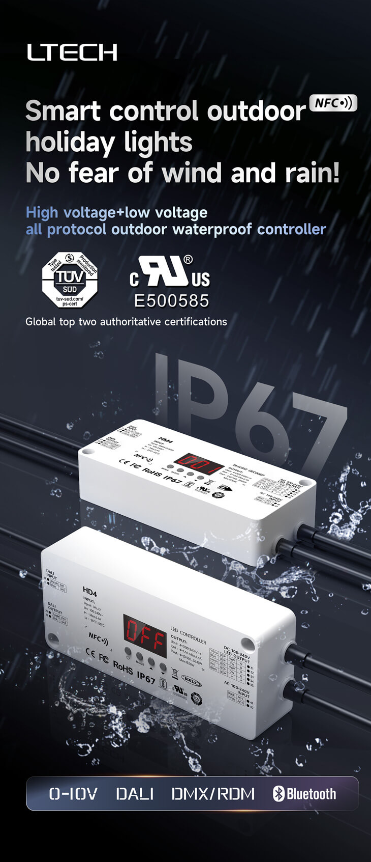 A matrix of waterproof controllers covering DALI,DMX, 0-10V, and Bluetooth protocols,Supports NFC near-field programming.the DMX series also supports RDM remote management eliminating the need for climbing and manual operation during outdoor engineering commissioning.Effortlessly handles complex scenarios such as building lighting and festive decorations.The product has passed international certifications including TÜV, UL, CE, FCC, ROHS, and BIS,remaining stable and reliable even in harsh environments.